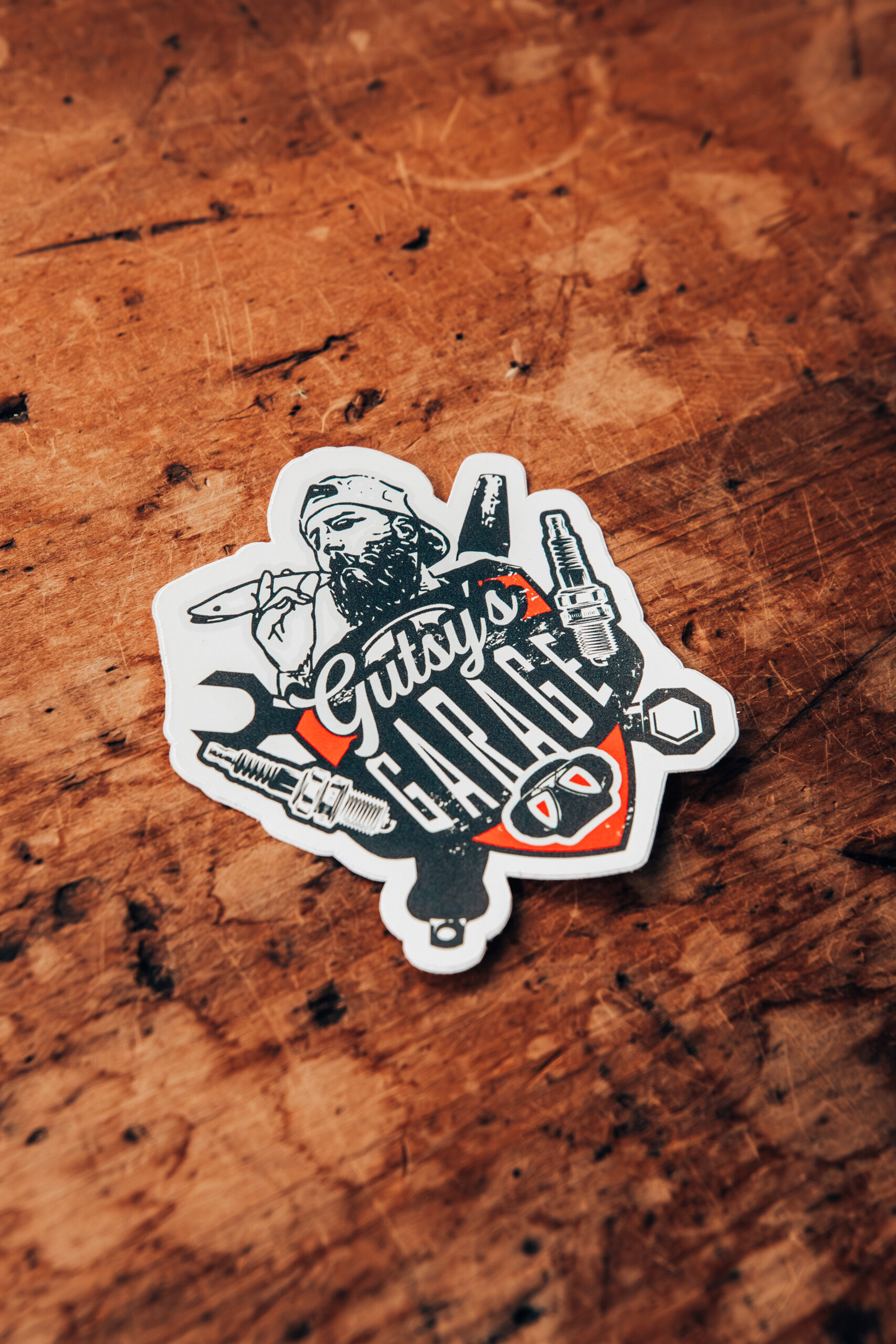 - Gutsy’s garage sticker: 71mm wide x 75mm high, colour – black, red, baby blue, matte finish